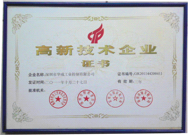 深圳市科技工貿和信息化委員會、深圳市財政委員會、深圳市國家稅務局、深圳市地方稅務局四家政府部門經過聯合評審,于二0一一年十月二十七日,授予華成公司國家級“高新技術企業”證書,證書編號為GR201144200411。